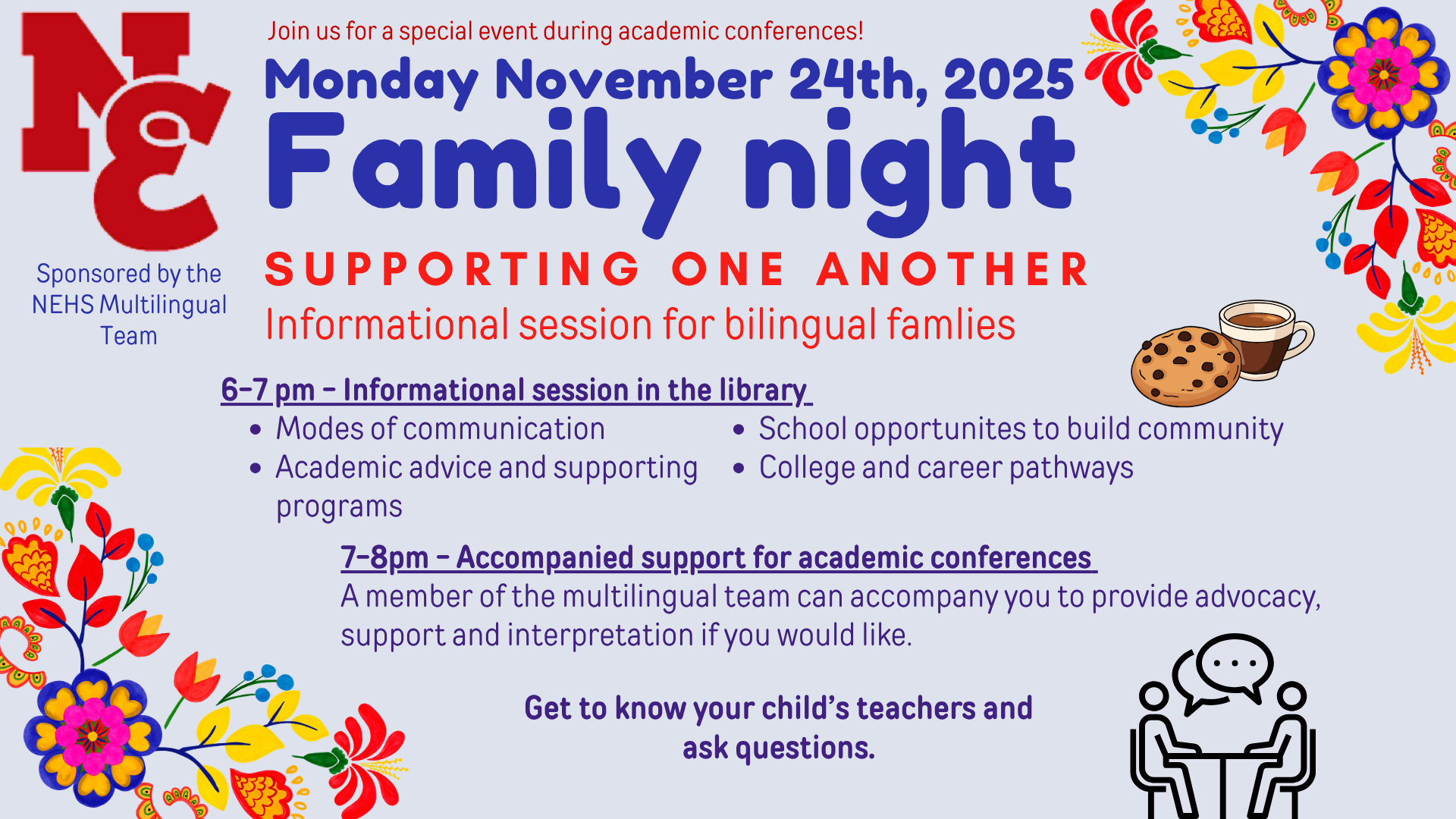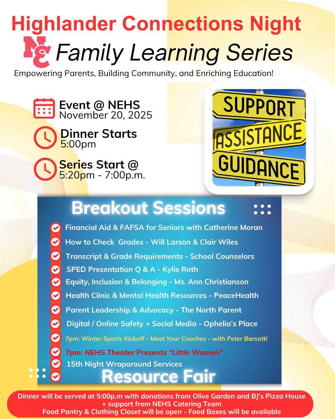 This special night brings together families, students, and community partners to explore topics that matter most—academic success, mental health, leadership, digital safety, and more. Meet our staff, discover local resources, and find new ways to support your student’s journey at NEHS and beyond.