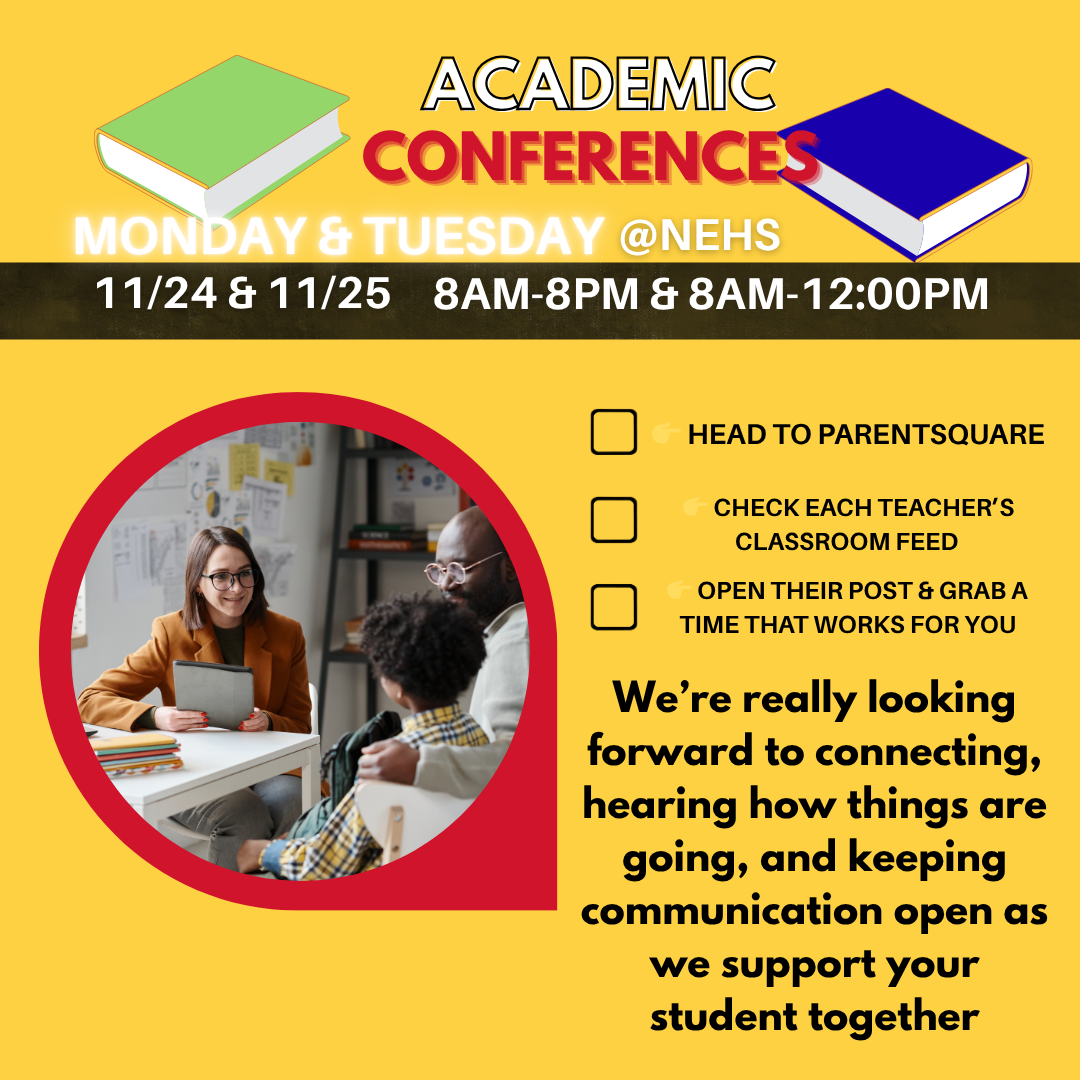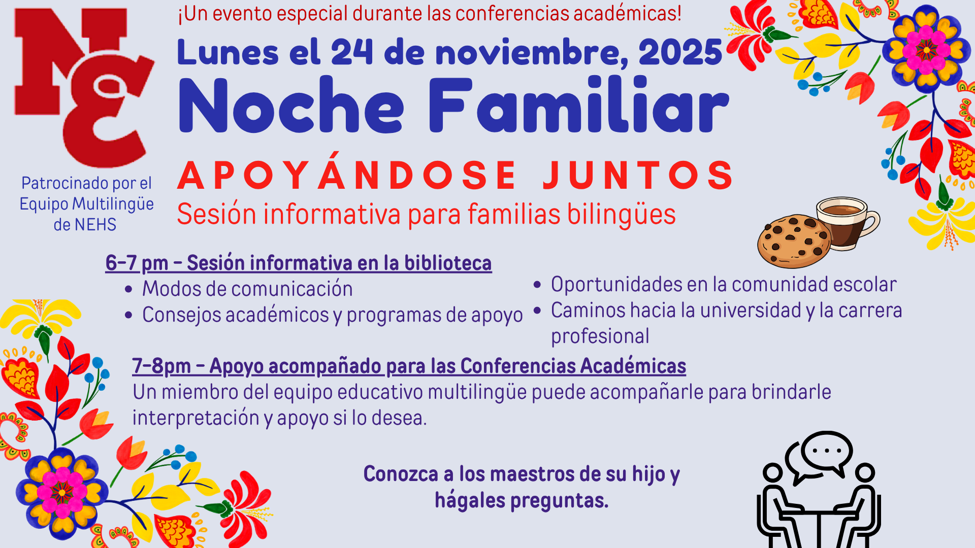 ¡Buenas noticias! Durante las conferencias académicas del 24 de noviembre, tendremos intérpretes de español y apoyo especial para nuestras familias hispanohablantes. Además, habrá una Sesión Informativa en Español de 6:00–7:00 p.m. en la biblioteca para conocer más sobre oportunidades académicas y cómo apoyar a su estudiante.