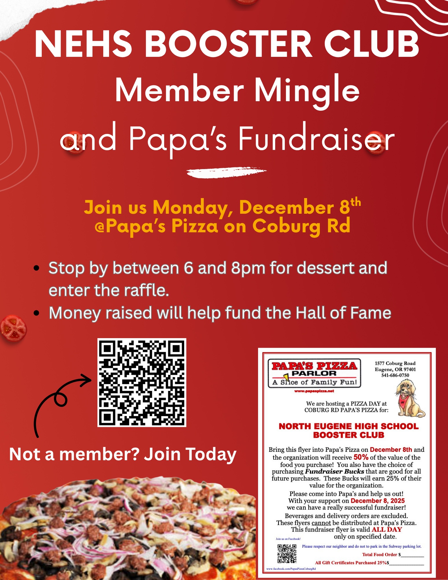 North families are invited to join the NEHS Booster Club at Papa's Pizza on Monday, Dec 8th for a pizza fundraiser. The Booster Club is holding a Member Mingle between 6-8 pm and will have dessert for you along with a raffle for NEHS swag. Come show your support for all the athletics and clubs at North!