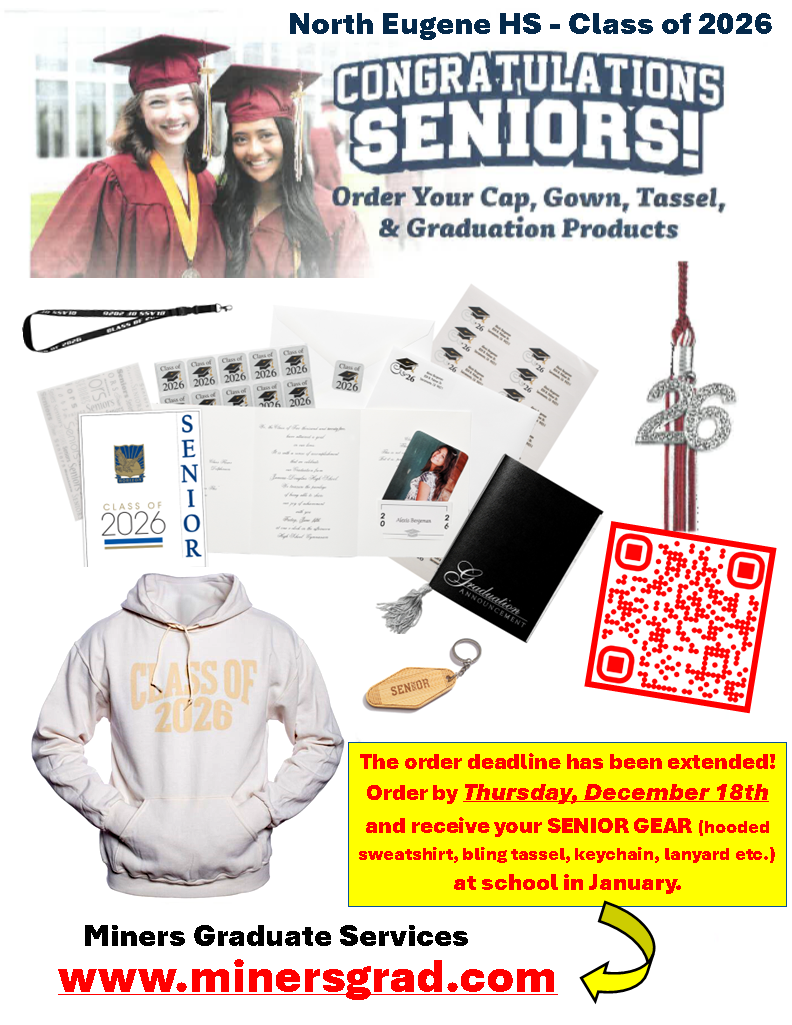 Order online by Thursday, December 18th to avoid any late fees and/or production restrictions and receive your Class of 2026 Gear (sweatshirts, bling tassels etc.) at school in January.